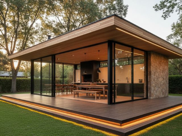 Quincho con estructura metálica de acero, parrilla integrada deck WPC y techo de madera. montaje rápido y diseño resistente.