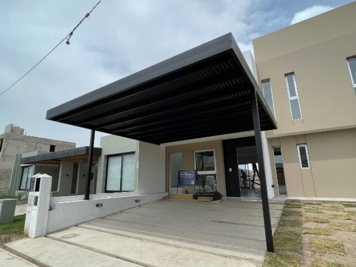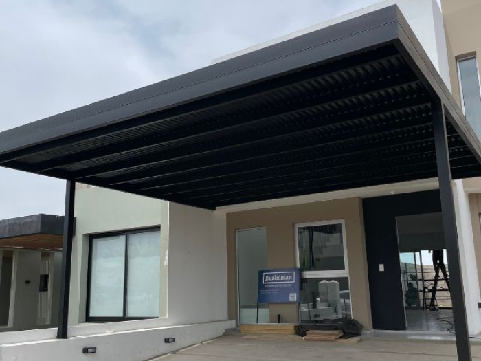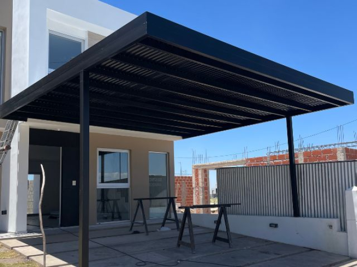 Cochera con caños de hierro, chapa metalica prepintada negra, canaletas y terminaciones de alta calidad, excelente para añadir estética y funcionalidad a tu casa. Realizamos estas cocheras en 3 dias para que puedas disfrutarlas lo antes posible.